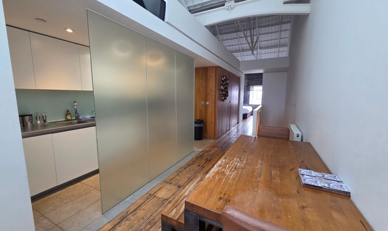 With useful shelving area, large built-in cupboard with further open storage space below, door to