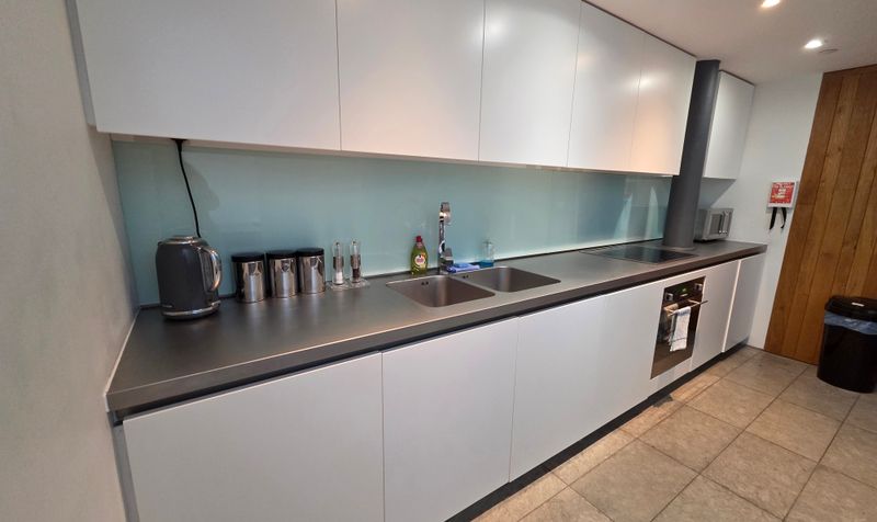 Again with high ceiling. A newly fitted kitchen with a range of cream fronted base and eye level units, soft close and with stainless steel furniture. Hard wood work surfaces in a butchers block style with green slate splash back, one and a quarter bowl sink, integrated electric 4 ring hob with electric fan oven below with extractor over. Integrated fridge/freezer, dishwasher, concealed lighting beneath the wall units. Brazilian green slate tiled flooring, leaded light window to front aspect.