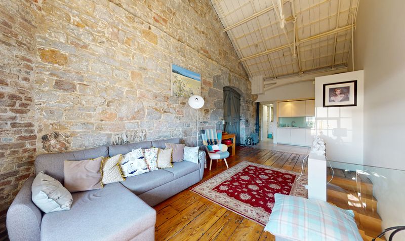 Stairs lead down to the bedroom which has feature stone and brick walls, original floorboards, built-in floor to ceiling wardrobes, a storage cupboard and a door leading to the first floor communal hallway.