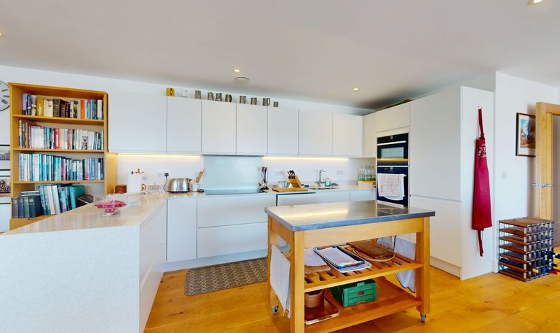 Communal door leads into entrance lobby with further door leading through to lift and stairs access to fourth floor. Oak panelled apartment front door leads into entrance hall with engineered timber flooring, cupboard housing the washer/dryer and doors through to: open plan living room with continuation of engineered timber flooring, sliding doors onto west facing balcony with views across Mount Edgcumbe and the Tamar estuary. U-shaped kitchen fitted with matt handleless wall and base units, Silestone work surfaces and splashbacks, 3 in 1 hot water tap, integrated Neff appliances including induction hob with extractor, combination oven and warming drawer, fridge/freezer and dishwasher. Master double bedroom with sliding doors onto inset west facing balcony with views of Mount Edgcumbe and the Tamar estuary and en-suite shower room fitted with white contemporary suite to include fully tiled shower cubicle, wash hand basin with storage drawer beneath, WC with low level sensor controlled lighting and tiled flooring, further double bedroom and bathroom also fitted with white contemporary sanitary ware to include tiled panelled bath with shower over, wash hand basin with storage drawer beneath, WC and tiled flooring. This property also benefits from two allocated parking spaces with visitor parking also available.