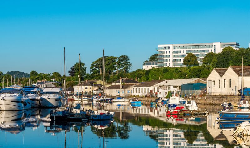 Leeward House – urban living meets waterside in contemporary apartments. 4th floor premium unit includes 2 west-facing balconies with views to Mount Edgcumbe & Tamar estuary. Communal entrance, open living area, U-shaped kitchen, 2 double bedrooms (1 en-suite), 2 parking spaces.