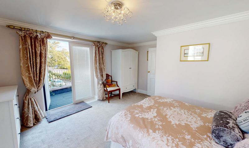 The principal bedroom occupies a superb position at the rear of the property, enjoying dual-aspect views over The Millfields. French doors open directly onto a private balcony, offering a delightful spot for morning coffee or evening relaxation while overlooking the surrounding greenery. The bedroom itself is spacious and tranquil, providing ample room for wardrobes and furnishings while maintaining a sense of luxury and comfort.