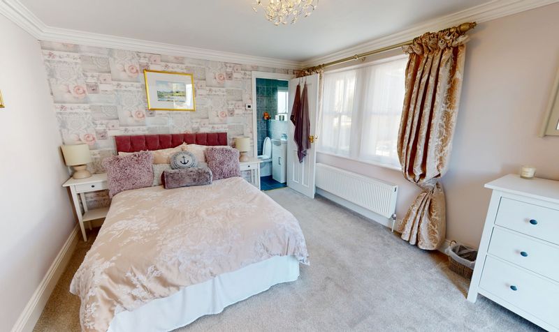 The en-suite shower room has been designed and finished to an exceptional standard, featuring a walk-in glass shower enclosure, low-level WC, and a stylish vanity basin with storage beneath. Underfloor heating ensures warmth underfoot, while fully tiled walls and an obscured window to the side elevation create a bright yet private atmosphere. Chrome fittings, recessed lighting, and a sleek mirror complete this elegant and contemporary space.