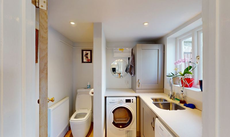 A door from the kitchen leads through to the utility room, designed with practicality in mind. This useful space provides additional work surfaces and storage, as well as plumbing for a washing machine and tumble dryer. A fitted sink and drainer unit, low-level WC, and shelving make this an ideal area for laundry, cleaning, or keeping household items neatly tucked away. A window to the side elevation allows for plenty of natural light, ensuring the room feels airy and functional.