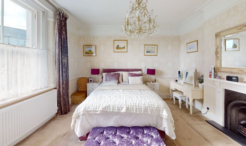 The lounge is an inviting and elegant living area, enjoying a dual-aspect outlook to both the front and side elevations. Large windows flood the room with natural light, enhancing its generous proportions and showcasing its beautiful period features. A striking feature fireplace with an open fire provides a stunning focal point, perfect for cosy winter evenings, while intricate ceiling rose detailing adds to the room’s timeless charm. Neutral décor and soft tones create a calm and welcoming space ideal for relaxing or entertaining guests.