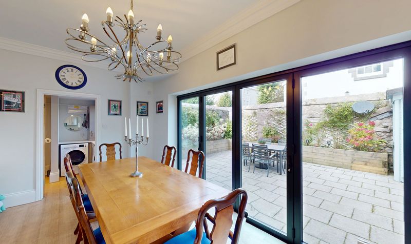 The kitchen/dining room is truly the heart of the home — a stunning open-plan space that combines contemporary design with a relaxed, welcoming atmosphere. Bi-folding doors extend the living area seamlessly onto the private rear garden, making this an ideal setting for summer gatherings or tranquil evenings outdoors. The kitchen itself has been finished to an exceptional standard, with a comprehensive range of high-gloss wall and base units complemented by luxurious granite work surfaces. Every detail has been carefully considered, from the sleek handleless cabinetry to the stylish under-counter lighting and polished chrome fittings.
