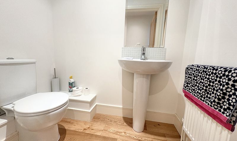 Low level WC, pedestal wash hand basin with wall mounted mirror, and wall mounted radiator.