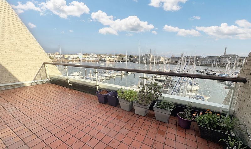 Spacious terrace with attractive views over the marina, offering space for potted plants and outdoor dining.