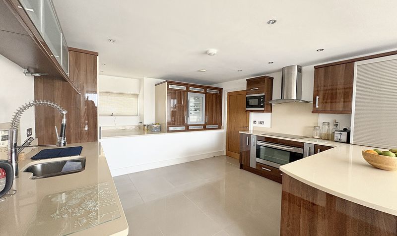 A selection of wall and base mounted units with square edge work surfaces, incorporating a peninsula with matching upstand and splashback. The kitchen features an integrated AEG oven, AEG Electrolux microwave, inset induction hob with extractor above, a built in Siemens wine cooler, integrated fridge and freezer, an integrated Neff dishwasher, and an Electrolux washer/dryer. A double glazed window to the rear elevation provides natural light, and the kitchen seamlessly blends into the open-plan lounge and dining area.