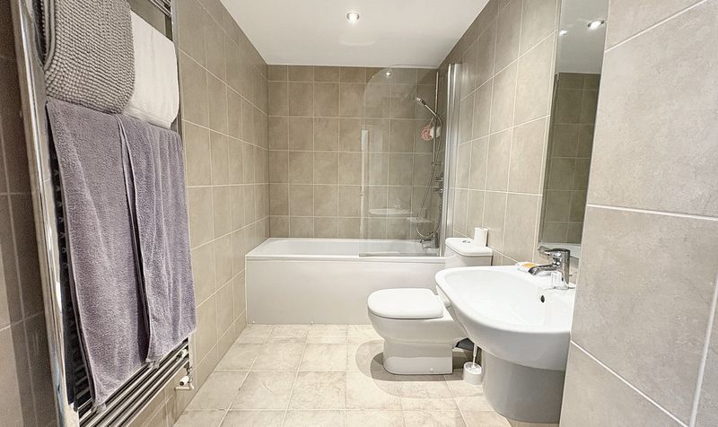Wash hand basin with mixer tap, wall mounted mirror, low level WC, panelled bath with mains fed shower over, chrome heated towel rail, fully tiled walls and floor, and extractor fan.