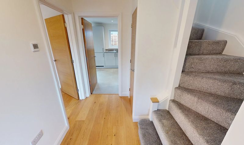 Front door leads into the entrance hallway with underfloor heating, stairs leading up to first floor and understairs storage cupboard. Doors lead through to: