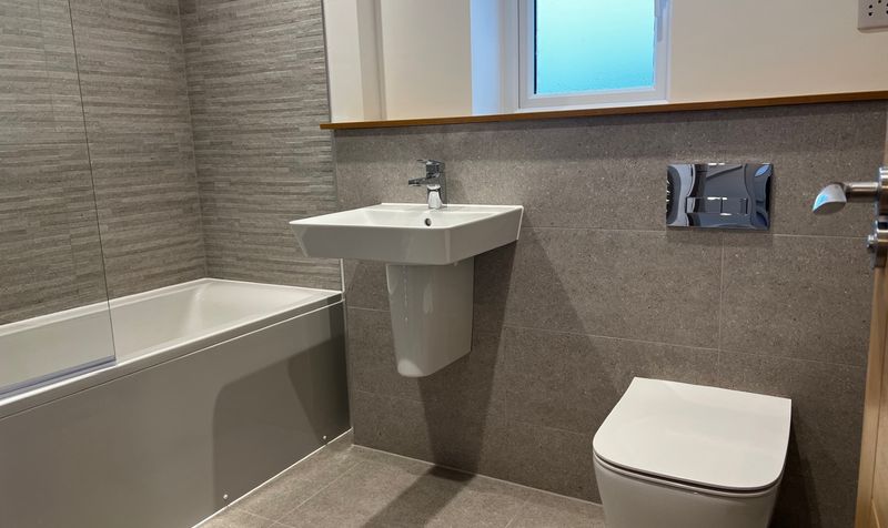 A family bathroom with white suite comprising panelled bath with shower over and glazed screen, wall mount wash hand basin and wc. Heated towel rail and half height tiling extended to full height around bath. Tiled flooring and triple glazed frosted window.