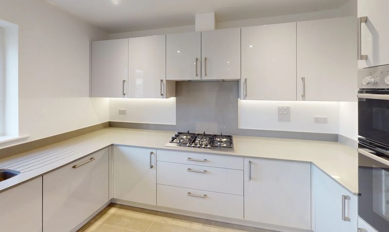 U-Shaped kitchen with fitted soft closing wall and base units and Duropal worktop and matching up stand, (currently there is availability of choices for the kitchen and work top). Under unit LED lighting. Integrated appliances to include fridge/freezer, five burner gas hob with concealed extractor above and stainless steel splashback and stainless steel tall electric double fan oven and dishwasher. One and half bowl stainless steel sink unit with drainer. There is plenty of space in the dining area for table and chairs etc. with Bi-Fold doors leading out to the south facing rear garden. Tiled flooring with underfloor heating.