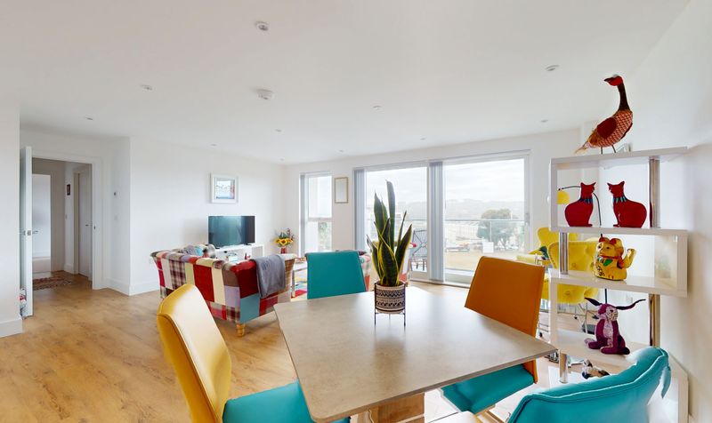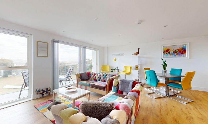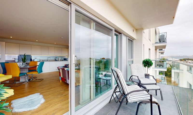 Open plan Living Room with continuation of Porcelanosa laminate wood flooring and kitchen to the rear of the room fitted with Smeg appliances to include: induction hob, fan oven, fridge/freezer and dishwasher. Space for dining room table and chairs. Sliding doors opening onto the southerly facing balcony with glazed balustrade and panoramic views across the cricket pitch out to Plymouth Sound and around to Mount Edgcumbe. There is also BT Fibre Optic directly into the building or a further choice of Virgin Media.